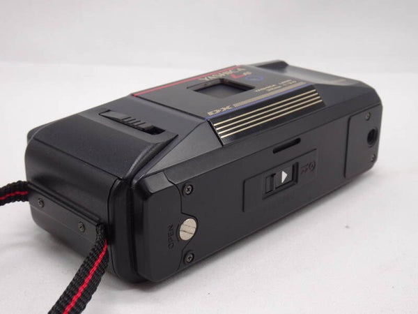 It uses a Yashica branded 32mm f/3.5 auto focus lens. The lens is able to focus from 0.8 to inf. The lens is proteced by a cover that retract when the power slider is enabled. It has shutter speeds from 1/30 to 1/450 of a sec. DX coded 100 to 1000 ISO can be used. Power is with a lithium 2CR5.