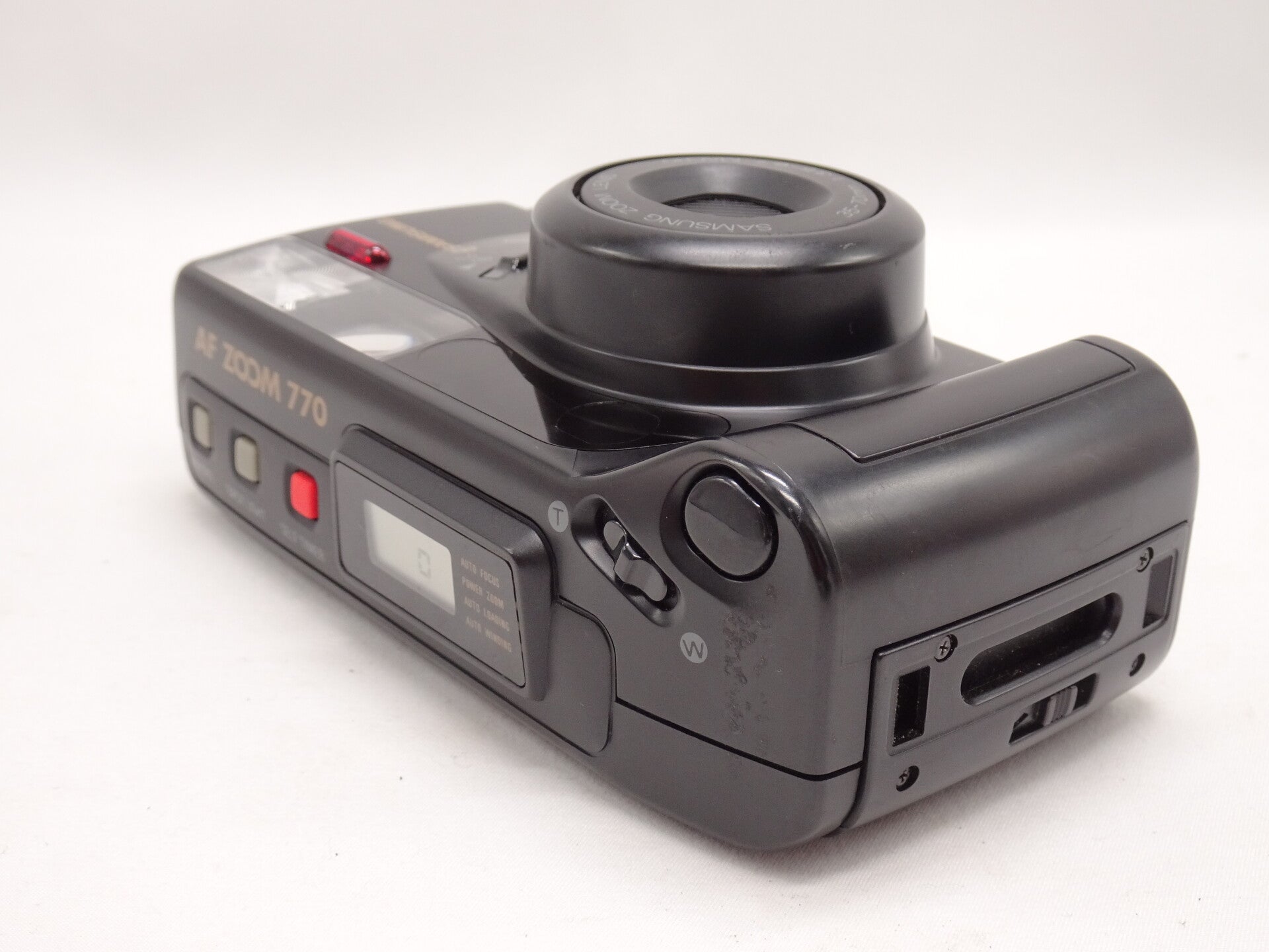 The Samsung AF Zoom 770 is a 35mm compact point-and-shoot film camera manufactured by Samsung, known for its versatile zoom lens and fully automatic operation. It was released as a user-friendly option for film photography, often featuring a sleek black, plastic body.